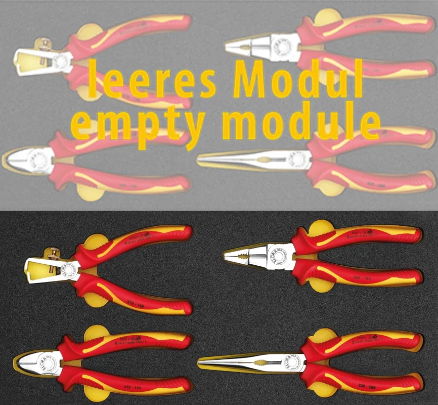 Werkzeugwageneinlage ELORA-OMS-42 aus PE-Hartschaum, wahlweise leer oder mit 4-teiligem VDE-Zangensatz.
